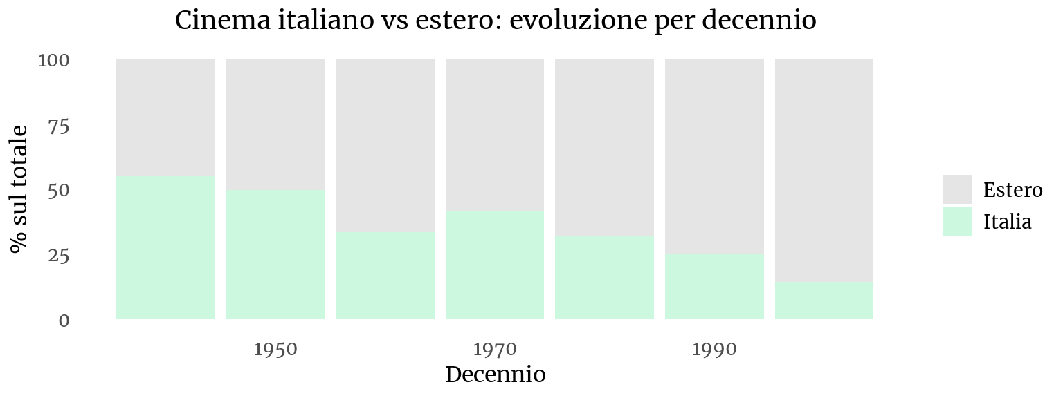 L’analisi dei paesi di produzione dei film proiettati al cinema Sestito consente di osservare l’evoluzione delle dinamiche industriali e distributive. Il primo grafico presenta un confronto percentuale tra film italiani ed esteri aggregato per decennio, mettendo in evidenza alcune tendenze strutturali decisive per comprendere la storia della sala e il suo rapporto con il sistema produttivo nazionale.