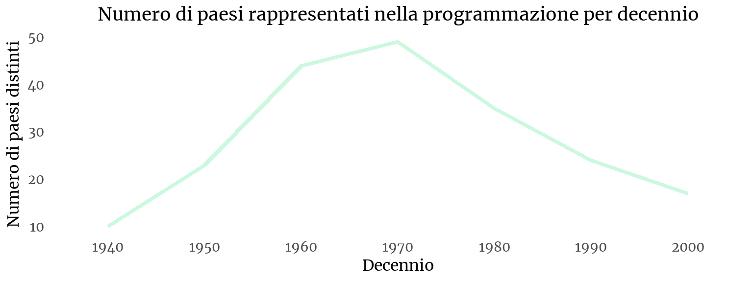 Per offrire una prospettiva complementare, il secondo grafico mostra il numero di paesi produttori rappresentati in ciascun decennio. Questo indicatore consente di valutare la diversità geografica dell’offerta cinematografica della sala al di là del confronto Italia/estero. Il grafico evidenzia un andamento curvilineo: un primo periodo in cui la programmazione comprende film provenienti da circa 10–20 paesi (anni ’40–’50), seguito da un ampliamento significativo negli anni ’60 e soprattutto negli anni ’70, quando si raggiunge il massimo di circa 50 paesi rappresentati. Tale espansione riflette la crescente globalizzazione del mercato, l’intensificarsi delle coproduzioni internazionali e l’arrivo di film provenienti da aree extraeuropee.